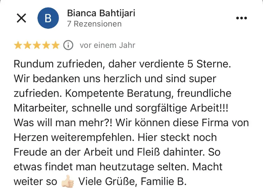 Die Sanierung kann in etwa 4-6 Wochen starten. Da wir das ganze Jahr über arbeiten und keinen festen Betriebsurlaub haben, sind wir flexibel. Sie können Ihr bevorzugtes Umbau-Datum auswählen. Klicken Sie dafür Hier